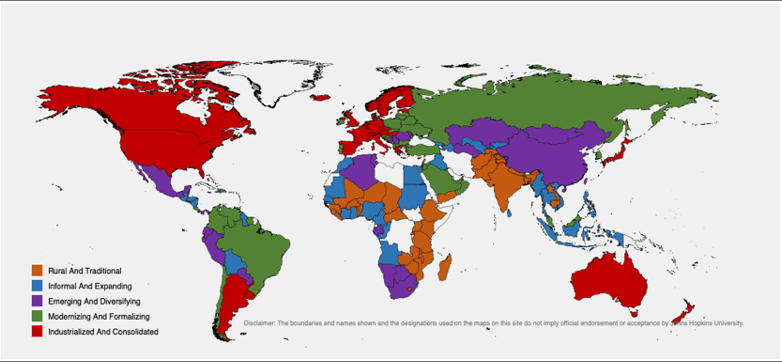 O mapa abaixo mostra o sistema de produção de alimentos dominante em cada país, de acordo com a Food System Dashboard (2020):